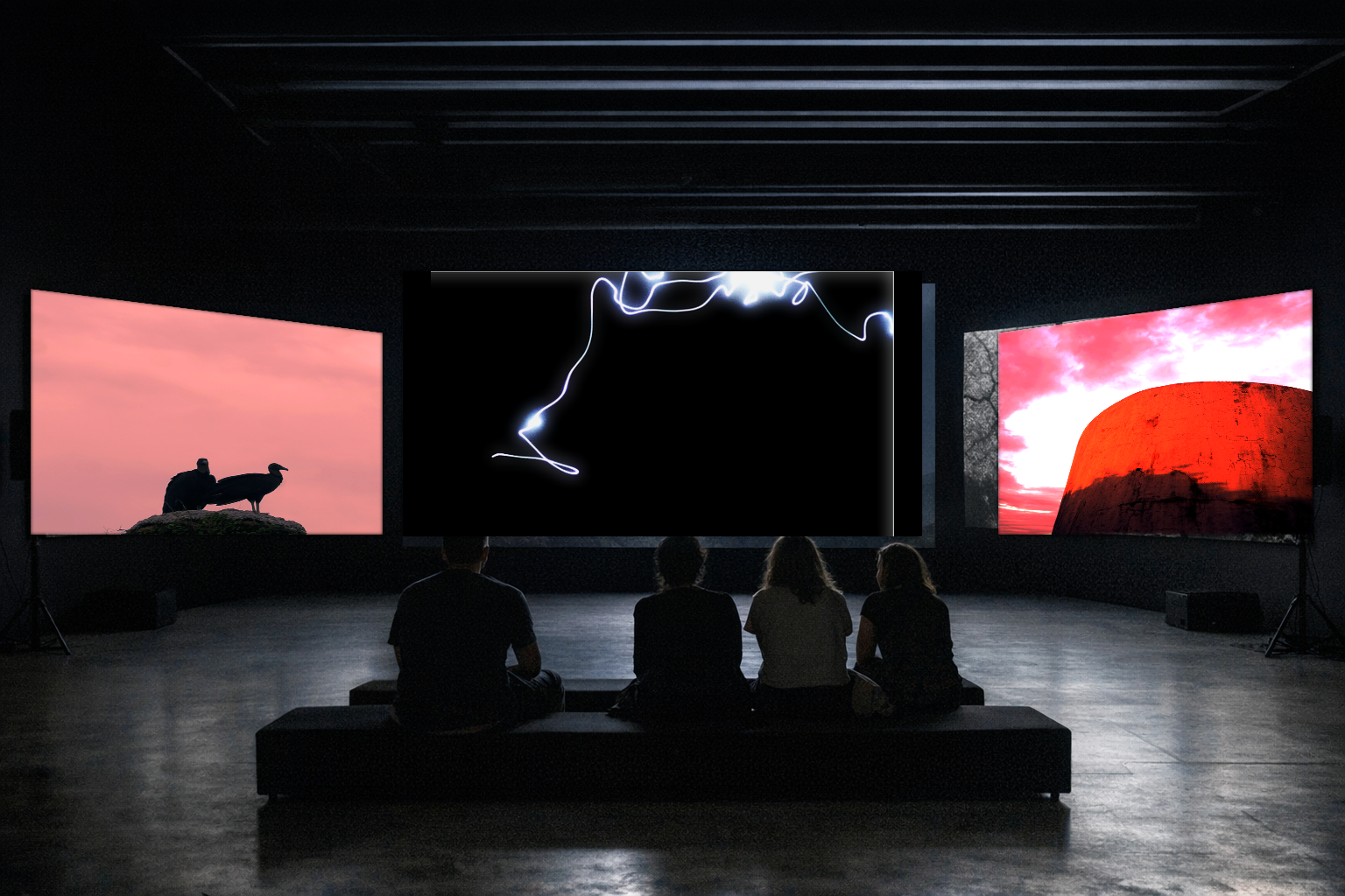 GRIETAS es una instalación audiovisual con un lenguaje sensorial en tres pantallas sincronizadas. En las pantallas laterales se despliega un loop de archivo como memoria de fotografía en video, mientras la pantalla central sostiene una imagen de rayo que funciona como umbral. Al concluir el loop, las tres pantallas entran en un fondo negro con un breve diseño sonoro de viento envolvente y, a continuación, solo en la pantalla central inicia el cortometraje MANDRÁGORA completo, con créditos. La instalación es autónoma; el baile solo se habilita durante activaciones performativas programables.